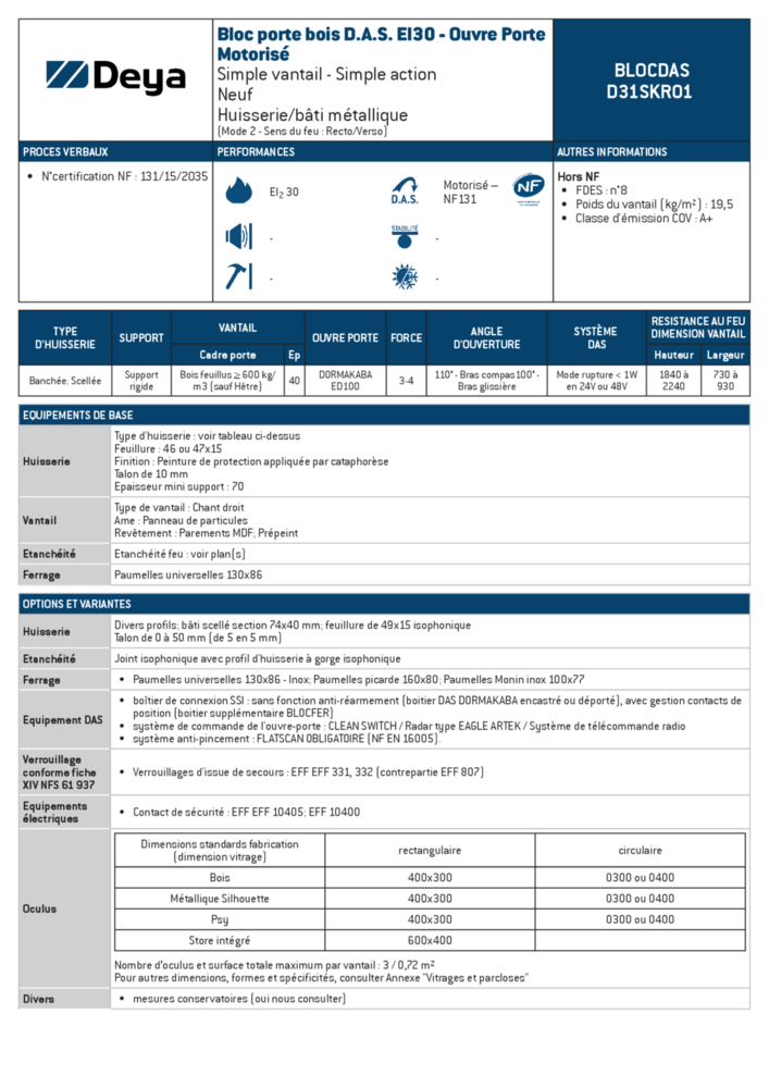 • Bloc porte DAS ouvre porte motorisé, validé en mode 2 avec la certification NF131